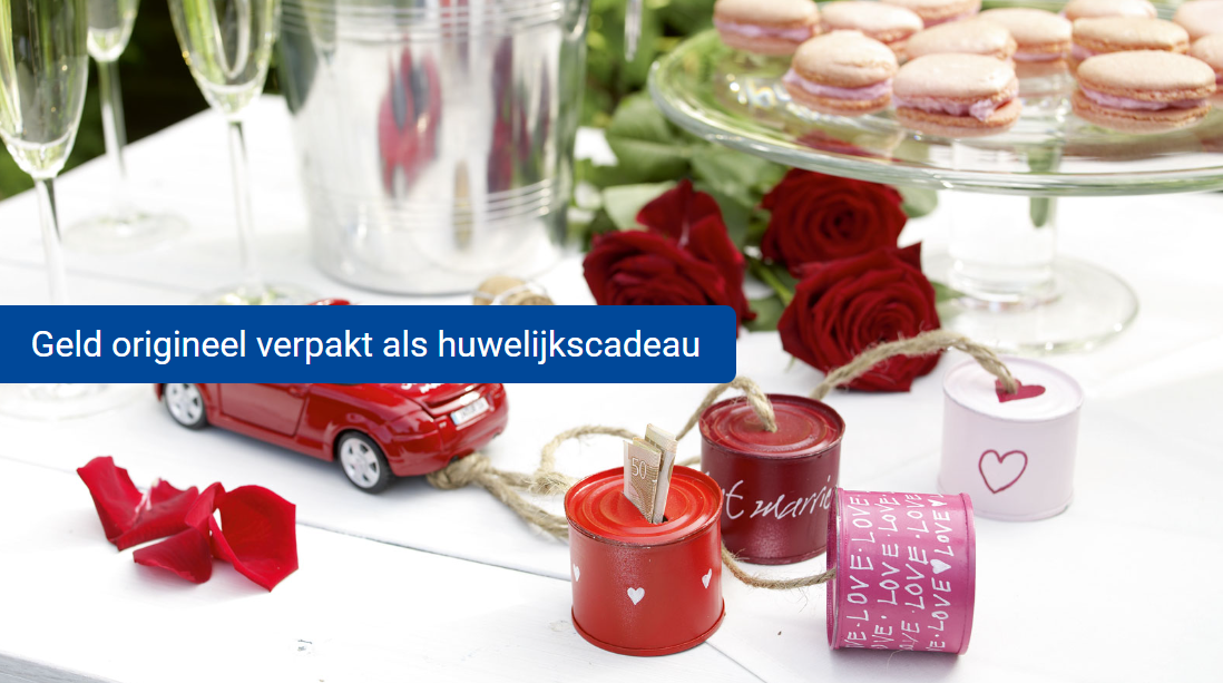 Vouw de bankbiljetten, schuif ze in de blikjes en bind ze met de koordjes aan het autootje. En klaar is jouw originele verpakking van je geldgeschenk voor het bruidspaar!