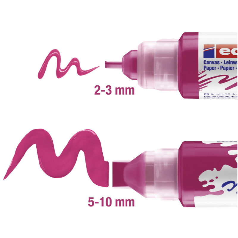 edding gaat door waar andere acrylmarkers stoppen. De edding Acrylmarker 5400 3D double liner is de nieuwste uitvinding. De tubevormige stift heeft twee mondstukken van verschillende grootte, 2-3 mm aan de ene en 5-10 mm aan de andere kant, en biedt u een unieke schilderervaring. De verf komt uit de tube door er alleen maar in te knijpen. Dankzij de twee spuitmonden van verschillende grootte, kan de verf in elke gewenste hoeveelheid aangebracht en gebruikt worden. Wordt de verf rechtstreeks aangebracht, geeft het uw kunstwerk wat plasticiteit. Zo is het natuurlijk ook mogelijk om de verf met een kwast aan te brengen. Ontdek de kunstenaar in uzelf want de mogelijkheden zijn eindeloos!
