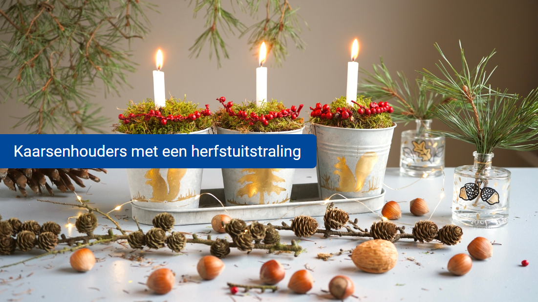 Sfeervol kaarslicht voor donkere herfstdagen Wanneer de bladeren van kleur veranderen, de eikeltjes uit de bomen vallen en de wind rond het huis giert, is het fijn om het binnen echt gezellig te maken. Sfeervol kaarslicht hoort daar absoluut bij! Je kunt zelfs gemakkelijk je eigen bijpassende kaarsenhouders maken. Pak gewoon een paar kleine metalen houders, zoals bloempotjes, en versier deze decoratief met behulp van glanslakmarkers, bijvoorbeeld met een goudkleurige eekhoorn zoals in ons voorbeeld.