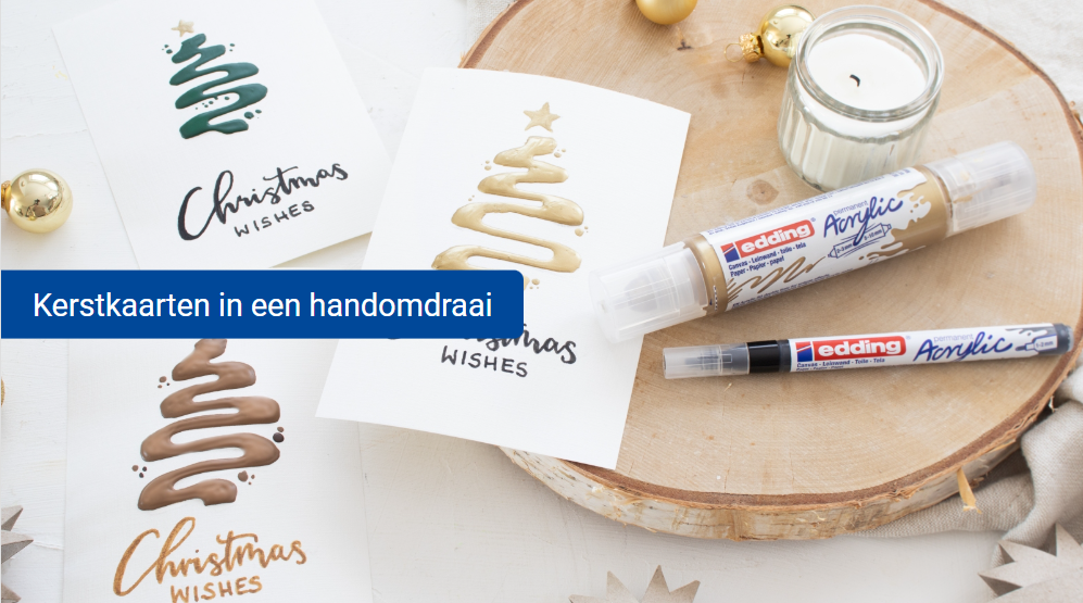 Niet alleen naaste familieleden, maar ook vrienden en bekenden waarderen een zelfgemaakte kaart. Iedereen is blij met een persoonlijke groet van jou! Ontdek hoe je eenvoudig indrukwekkende ontwerpen kunt maken met de acrylic 3D double liner van edding. Op de kaarten zijn gestileerde kerstbomen te zien, getekend in één vloeiende lijn van boven naar beneden. De edding 5300 acrylmarker fijn is ideaal om jouw kerstgroeten toe te voegen.