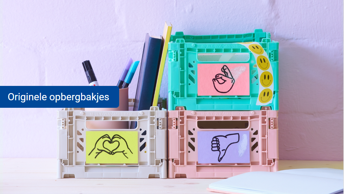 Kleine plastic bakjes zijn ongelooflijk handig om kantoorbenodigdheden en andere items netjes op te bergen en je bureau georganiseerd te houden. Niet alleen kun je speels met kleuren werken, maar je kunt ook bakjes stapelen. Door aanduidingen met gekleurde kaartjes, die je leuk kunt versieren met permanente markers, behoud je een perfect overzicht van al je spullen. We hebben enkele pakkende symbolen ontwikkeld die je, afhankelijk van je behoeften, kunt gebruiken. Natuurlijk kun je ook gewoon op de kaartjes schrijven. Permanente markers hechten blijvend op bijna alle materialen, en je hebt de keuze uit 20 watervaste kleuren.