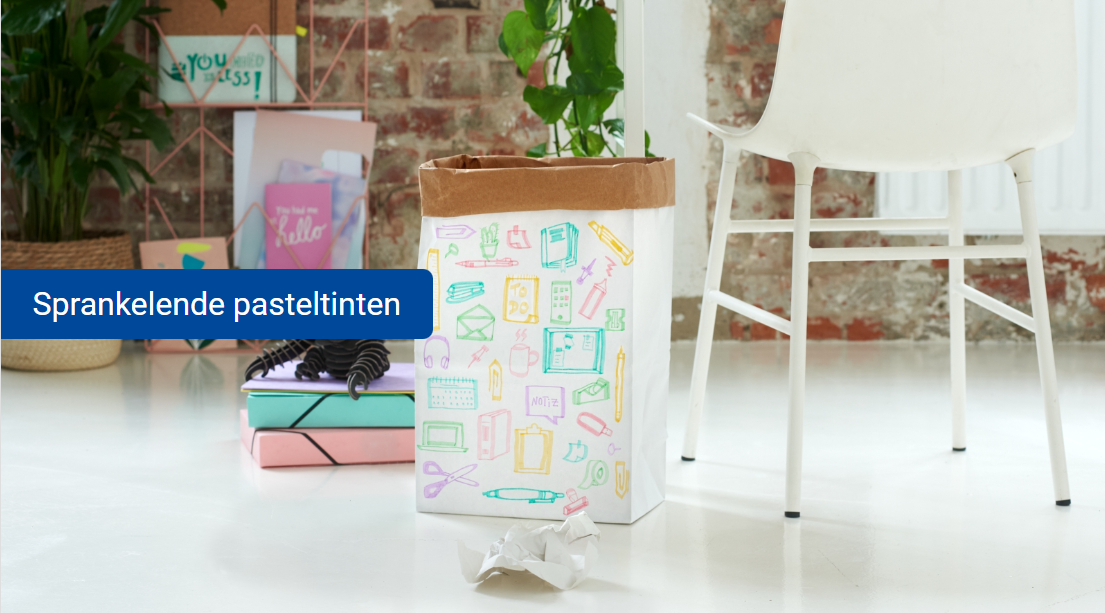 Grote papieren zakken zijn praktisch en milieuvriendelijk om spullen netjes op te bergen. Met pastelkleurige highlighters kun je de zakken op een persoonlijke manier versieren. In ons voorbeeld zie je verschillende motieven die je kunt overnemen.