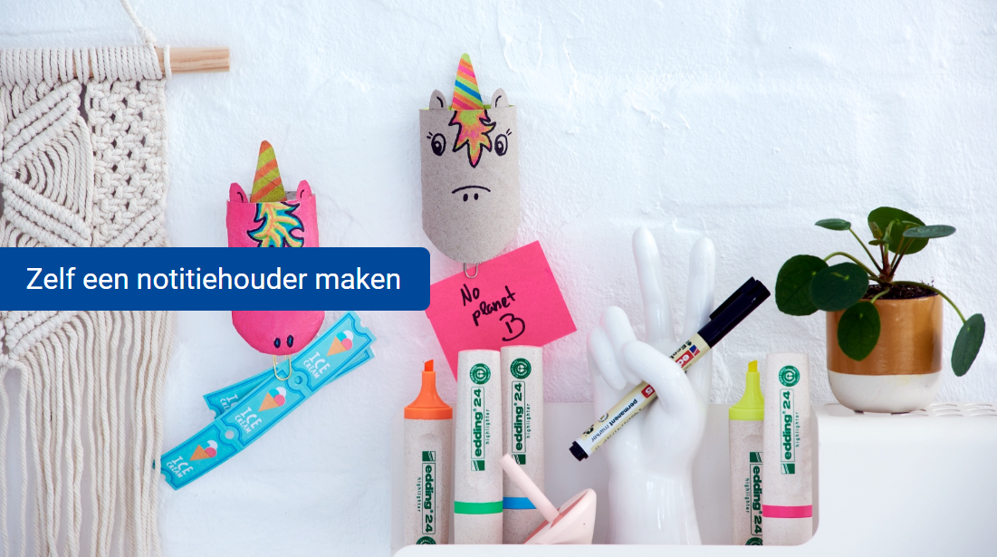 Als je huiswerk moet maken, word je binnen de kortste keren vrolijk van dit hobby-ideetje. Gemakkelijker kan niet; deze kleine notitiehouders met eenhoorn zijn gemaakt van lege wc-rolletjes en versierd met de heldere kleuren van highlighters. Schuif gewoon een paperclip op elk rolletje, plak het boven je bureau op de muur en voilà; klaar is jouw mini-memobord. En als je de EcoLine markers van edding gebruikt, doe je het milieu ook nog eens een plezier. De stiften uit deze serie worden namelijk vrijwel uitsluitend gemaakt van hernieuwbare grondstoffen of gerecyclede materialen.