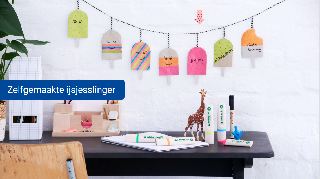 Voor dit knutselproject heb je edding 24 EcoLine highlighters nodig, samen met een zwarte edding 25 EcoLine permanente marker. Snijd het wc-rolletje eerst verticaal doormidden en vorm de bovenkant tot een ronde vorm, zodat het op een ijsje lijkt. Gebruik de overgebleven stukjes karton om een ijsstokje te maken en bevestig het stevig. Laat je creativiteit de vrije loop terwijl je met de highlighters aan de slag gaat en je ijsjes in levendige kleuren versiert. Laat je verbeelding spreken!