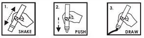 Stickerverwijderaar (met dop) schudden, dop verwijderen, stiftpunt plaatsen en voorzichtig op en neer bewegen totdat er olie naar de punt stroomt.